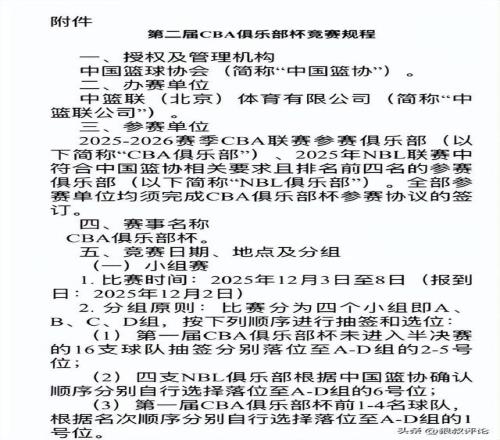 第二届CBA俱乐部杯计划在2025年12月3日至2026年2月12日期间举行,参赛范围包括CBA俱乐部及NBL俱乐部,其中NBL俱乐部须在参赛前向中国篮协提交相关参赛承诺,并以中国篮协最终名单审核确认为准。