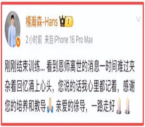 刚刚结束训练的杨瀚森第一时间得知噩耗,随即在社交媒体发文悼念: