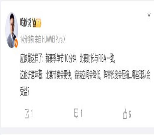 哈秋说:应该是这样了:新赛季单节10分钟,比赛时长与FIBA一致。