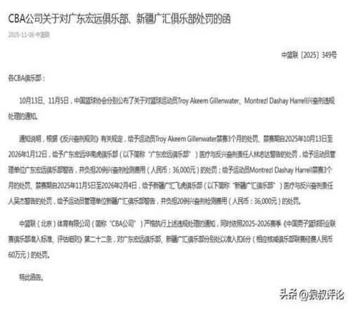 通知说明,根据《反兴奋剂规则》有关规定,给予运动员Troy Akeem Gillenwater禁赛3个月的处罚、禁赛期自2025年10月13日至2026年1月12日,给予广东宏远华南虎俱乐部(以下简称“广东宏远俱乐部”)医疗与反兴奋剂责任人林志达警告的处罚,给予运动员管理单位广东宏远俱乐部警告,并负担20例兴奋剂检测费用(人民币:36,000元)的处罚;给予运动员Montrezl Dashay Harrell禁赛3个月的处罚、禁赛期自2025年11月5日至2026年2月4日,给予新疆广汇飞虎俱乐部(以下简称“新疆广汇俱乐部”)医疗与反兴奋剂责任人吴杰警告的处罚,给予运动员管理单位新疆广汇俱乐部警告,并负担20例兴奋剂检测费用(人民币:36,000元)的处罚。