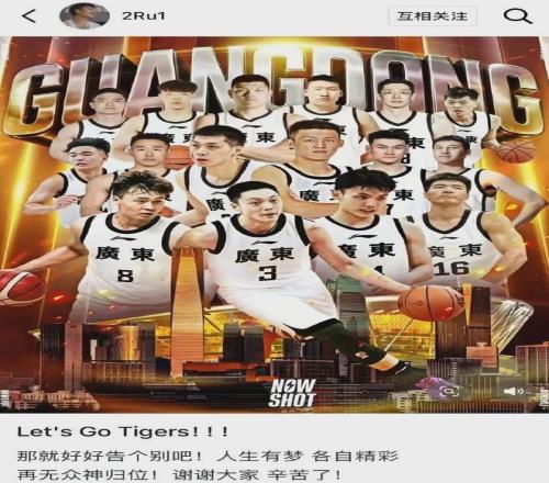 为广东队夺得今年全运会金牌之后,赵睿更新个人社媒,写道:“Let's Go Tigers,那就好好告个别吧,人生有梦,各自精彩,再无众神归位,谢谢大家,辛苦了。”