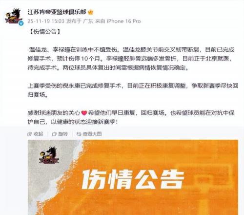 从江苏男篮的官宣中,我们能够了解到,温佳龙在训练中不慎受伤,导致膝关节前交叉韧带断裂,已完成修复手术,预计伤停10个月。