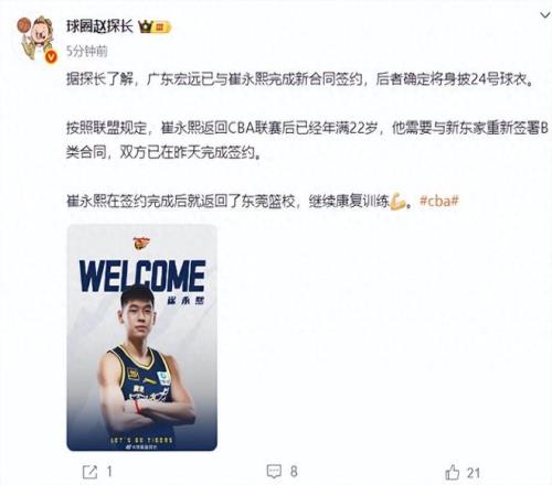 据媒体人“赵探长”报道,广东宏远已与崔永熙完成新合同签约,后者确定将身披24号球衣。按照联盟规定,崔永熙返回CBA联赛后已经年满22岁,他需要与新东家重新签署B类合同,双方已在昨天完成签约。崔永熙在签约完成后就返回了东莞篮校,继续康复训练。