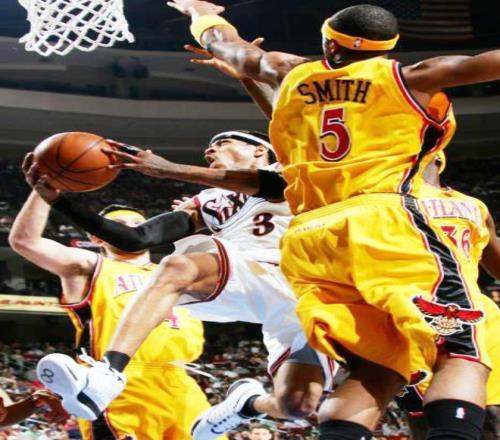 艾弗森的职业生涯场均26.7分,4次当选得分王,这些数据背后,是无数次 “1 打 2”“1 打 3”的突破得分。对手防他的策略很明确:外线派一人贴身盯防,不让他轻松启动;他突破时,内线立刻派一人协防,伸手干扰他的上篮;若他还能突破,就再派一人从侧后方封堵,形成 “三人围堵”。可即便如此,艾弗森仍能靠节奏变化欺骗防守者 —— 他能在突破时突然减速,让协防者扑空,再加速完成上篮;他能在被三人围堵时,用转身或背后运球摆脱,制造投篮空间。