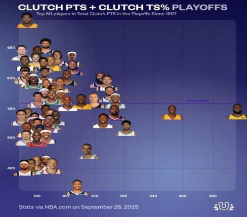 直播吧9月29日讯 近日,数据媒体NBA University总结了自从1997年以来(NBA官网该项数据统计起始时间)在NBA季后赛中关键得分前60球员的真实命中率分布图表。