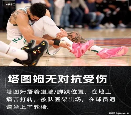 上赛季东部半决赛,在凯尔特人对阵尼克斯的系列赛G4比赛中,杰森塔图姆在无对抗情况下捂着跟腱/脚踝位置痛苦倒地!随后,塔图姆被队医架出场并坐上轮椅返回更衣室。最终,杰森塔图姆被确诊为右脚跟腱断裂!次日即5月14日,凯尔特人官方宣布,塔图姆成功接受了右脚跟腱断裂修复手术。至此,塔图姆2024-25赛季季后赛彻底报销!