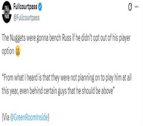 究竟威少为什么选择跳出合同?前NBA球员丹尼-格林在节目中透露,威少决定拒绝球员选项的原因是,掘金方面并没有打算让他进入轮换阵容,而是准备让他长期坐在板凳末端;消息人士称:据我所知,他们(掘金)今年根本没打算让他上场,甚至要把他排在某些本应在他之下的球员后面。