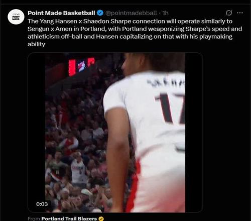 雷速体育10月11日讯 NBA季前赛,开拓者124-123战胜国王。赛后美媒Point Made Basketball连续发文赞扬杨瀚森,并表示杨瀚森与谢顿·夏普的组合类似于开拓者自己的申京与阿门。以下为原文: