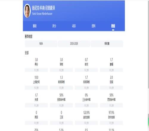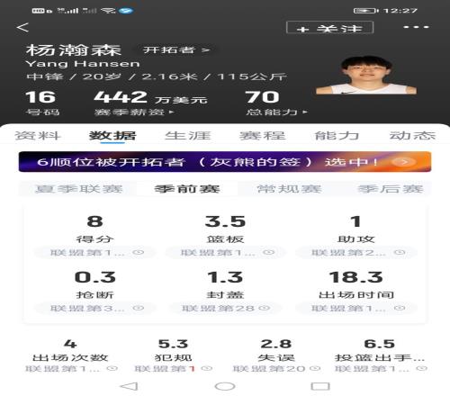 三场季前赛过后,他场均可获10.3分钟的出场时间,场均可砍下3分3篮板1.7盖帽,投篮命中率50%,无三分出手。