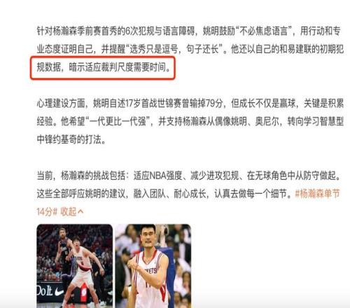 在前段时间的采访中,姚明也曾经提醒过杨瀚森,他列举了自己和易建联当初刚刚进入NBA发展时候的一些犯规次数,以此来提醒杨瀚森要适应裁判的尺度确实需要时间,同时年轻球员确实会更容易被吹罚。所以对于杨瀚森来说,既然已经决定闯荡NBA,你得适应那里的规则。只能够不断的调整自己,做得更好。
