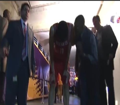 姚明就拖着几乎无法弯曲的右腿重返赛场,最后四分钟独得8分,带领火箭队取得胜利