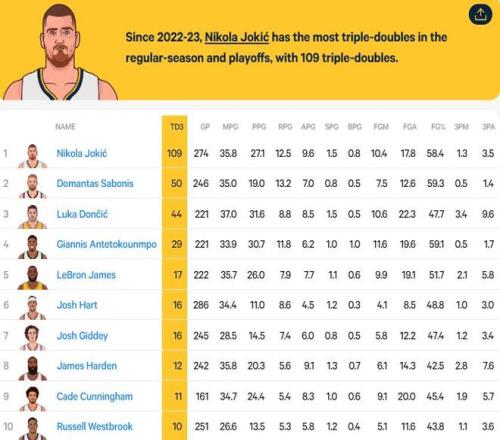 据NBA数据网站StatMuse统计,过去四个赛季,约基奇实际拿到了109次三双(包括常规赛和季后赛),第二名萨博尼斯仅拿到了50次,不足约基奇的一半。