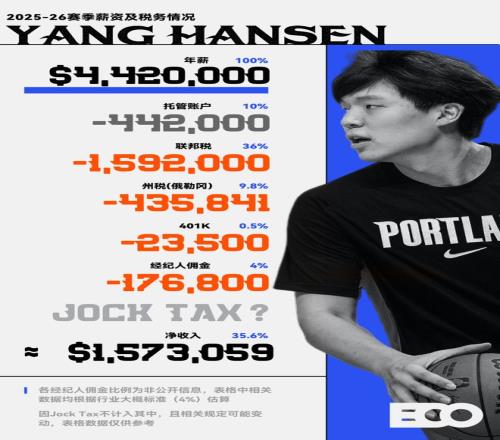 以杨瀚森为例——他在2025-26赛季的年薪为442万美元(约3100万人民币),仅联邦税一项,就要缴纳约159.2万美元,占总薪资的36%。