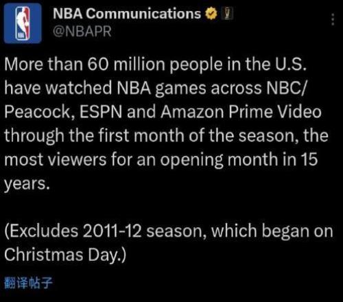 当然,收视率暴增的原因和NBA更换转播商有很大关系,现在亚马逊和NBC的覆盖率远超TNT!