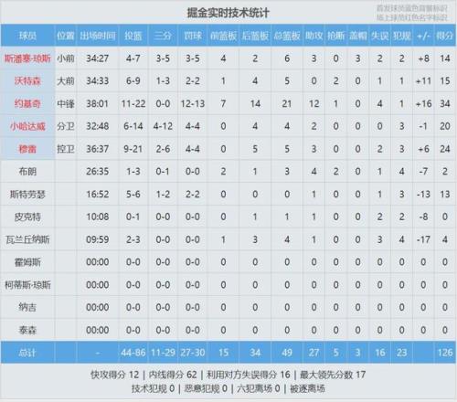 掘金本来有机会绝杀,可惜穆雷最后一投打铁。此役穆雷21投9中,拿到24分5篮板3助攻2失误,正负值+6。约基奇21投11中,砍下34分21篮板12助攻。约基奇生涯总三双数来到180次,距离历史第二的大O罗伯特森只差1次。