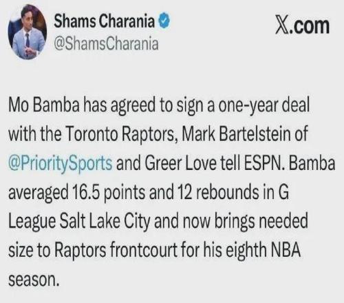 爆料王Shams:班巴以一年合同加盟猛龙。猛龙队记Murphy对此表示,班巴的合同为无保障,本质上是一份为期12天的短合同。