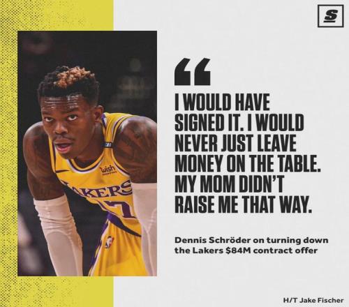 2020年12月,施罗德拒绝湖人2年3340万美元的续约合同。2021年3月,多家媒体报道,施罗德拒绝湖人开出的4年8000万美元续约合同。2021年休赛期,施罗德1年590万美元加盟凯尔特人,他拒绝大合同的事情也被拿出来群嘲。
