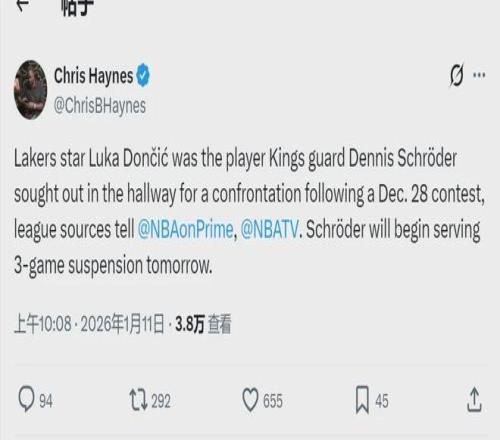 施罗德被禁赛将从明天对阵火箭开始,三场比赛让他损失29.2万美元。大家对这笔罚单有两个疑问:1、两周前的比赛,为啥现在才公布处罚结果?2、施罗德想殴打的湖人球员是谁?Chris Haynes补充报道,这个湖人球员是东契奇!