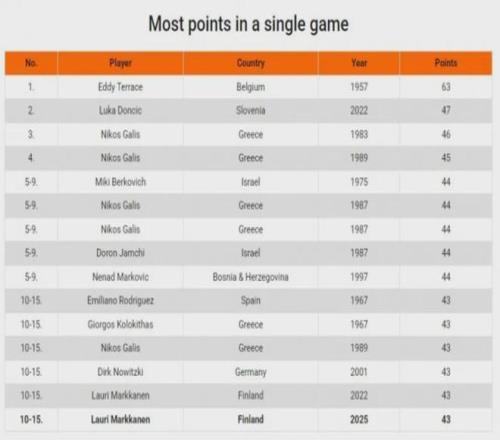 这是马尔卡宁生涯第2次在欧锦赛拿到43分,在欧锦赛历史单场得分榜上排名第10,跟诺维茨基、加里斯、科洛吉塔斯、罗德里格斯等前辈并列。