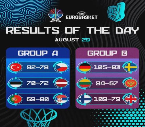 塞尔维亚80比69完胜葡萄牙,芬兰109比79打爆英国,拉脱维亚72比70险胜爱沙尼亚,立陶宛94比67轰平黑山,土耳其92比78击败捷克,德国105比83大胜瑞典。