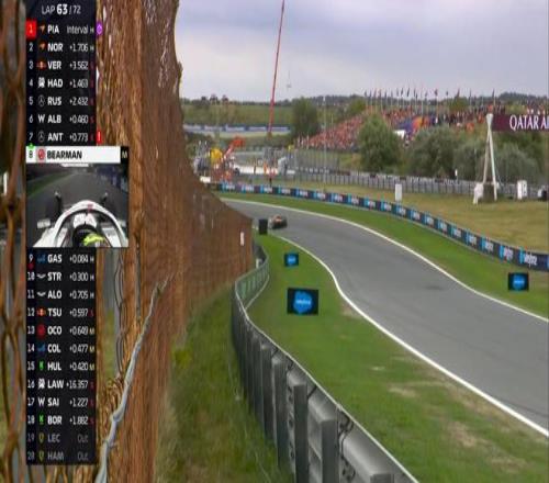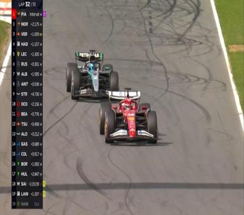 第32圈:勒克莱尔在11号弯开上砂石地强硬挤进内线,超越拉塞尔上升至第5!