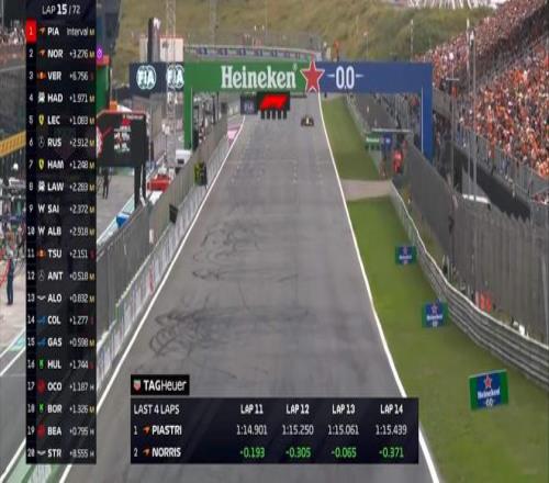 第15圈:诺里斯保持追近的态势,勒克莱尔已经掉出哈贾尔的DRS区间;
