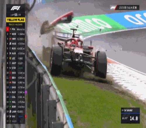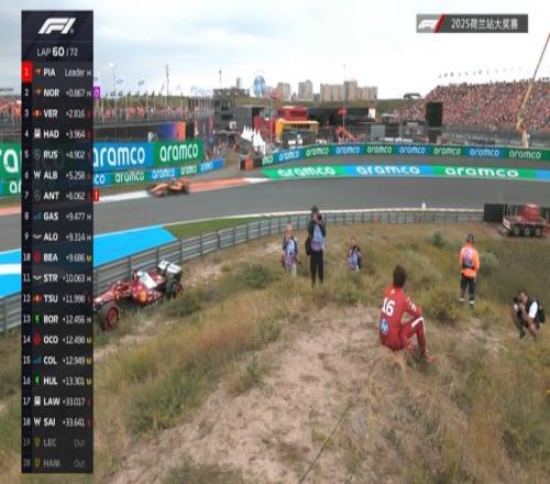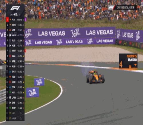利用这次安全车的契机,维斯塔潘、哈贾尔、拉塞尔、阿尔本以及安东内利都换上软胎进行最后的冲刺!谁料,比赛在第66圈再次迎来高潮!这一圈,诺里斯通过TR告知车队自己的座舱内有烟,随后他的赛车就因漏油停在了赛道上,只能无奈退赛!