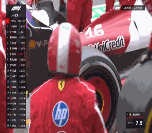 第20圈,角田、克拉平托和霍肯伯格进站换胎,他们在出站后掉至队尾。第23圈,法拉利主动求变,勒克莱尔进站换上白胎,仅耗时2秒!然而就在他出站后没多久,队友汉密尔顿便上墙退赛并引发黄旗......勒克莱尔血亏......