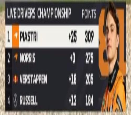 随后的比赛没有了任何悬念!最终皮亚斯特里实现Pole To Win,并且在积分榜上进一步拉开了和身后诺里斯的差距,又是达到了34分!