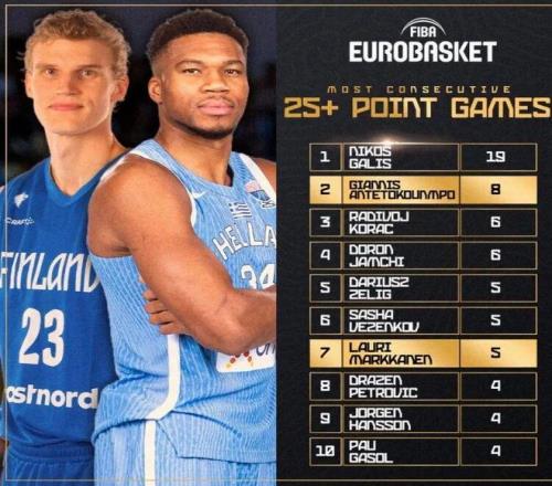 字母哥在欧锦赛已经连续8场得分25+,历史第二长,第一长的是希腊传奇
