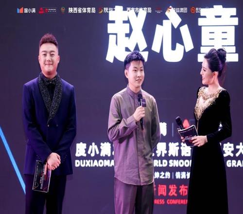 图为斯诺克名将赵心童在度小满2025世界斯诺克·西安大奖赛现场分享