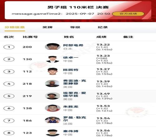 9月7日,2025世界田联洲际巡回赛(金标)北京站男子110米栏比赛中,徐卓一遭日本选手阿部竜希0.01秒极限反超,遗憾丢冠。
