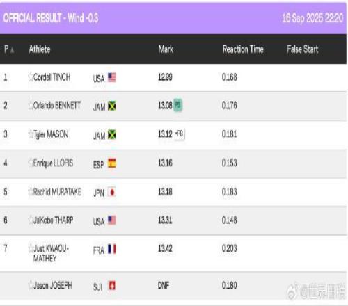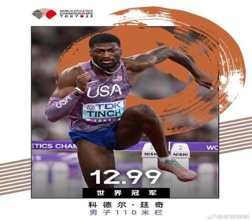 9月16日,2025年东京田径世锦赛男子110米栏决赛,本赛季世界最好成绩保持者廷奇12秒99获得个人110米栏世界大赛首冠。