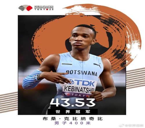 9月18日, 2025年东京田径世锦赛男子400米决赛,博茨瓦纳选手克比纳奇比跑出43秒53,继半决赛后再次刷新本赛季世界最好成绩夺冠,同时这一成绩足以让他跻身历史前10。