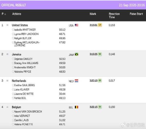 9月21日,2025年东京田径世锦赛女子4x400米接力决赛,美国队一路领先,镇守第四棒的麦克劳林再次跑出48秒以内的分段(47.82),最终3分16秒61打破赛会纪录,以超过2秒的优势轻松夺冠。