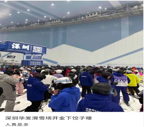 从开业首日流传的现场视频及图片来看,截至当日下午4点,雪场内的滑雪区域与公共区域仍保持较高人流密度,不少网友在社交平台调侃,现场人员密集的场景像“下饺子”。