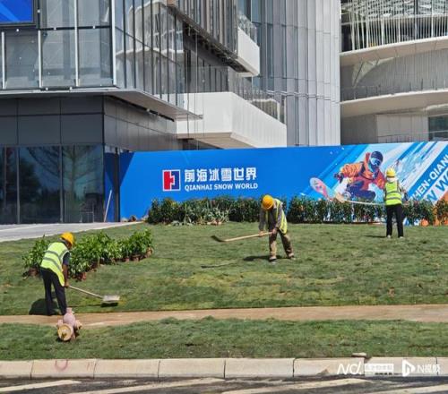 周边草坪绿化仍有工人正在作业。