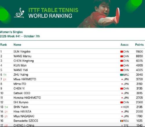 WTT中国大满贯女单四强申裕斌排名上升4个名次位列第13;八强朱雨玲排名上升1个名次位列第6;八强朱芊曦排名上升11个名次位列第24;十六强李昱谆排名上升21个名次位列第47,刷新个人职业生涯排名新高;三十二强汉娜·高达排名上升2个名次位列第23,刷新个人职业生涯排名新高;三十二强叶伊恬排名上升11个名次位列第48,刷新个人职业生涯排名新高;三十二强安娜-赫尔希排名上升22个名次位列第54,刷新个人职业生涯排名新高;三十二强朱思冰排名上升32个名次位列第68,刷新个人职业生涯排名新高。