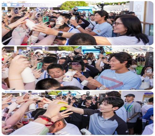 随后,光明优倍品牌代言人吴磊的空降,再次点燃全场。现场,青春活力的吴磊与郎平、张之臻共同化身“光明鲜活店长”,亲手为场外观众递上大师杯限定特调饮品、光明致优和光明优倍鲜牛奶等饮品,让每一位接过饮品的观众,都能直观感受到“近距离接触星光”的惊喜与“品尝鲜活营养”的满足。