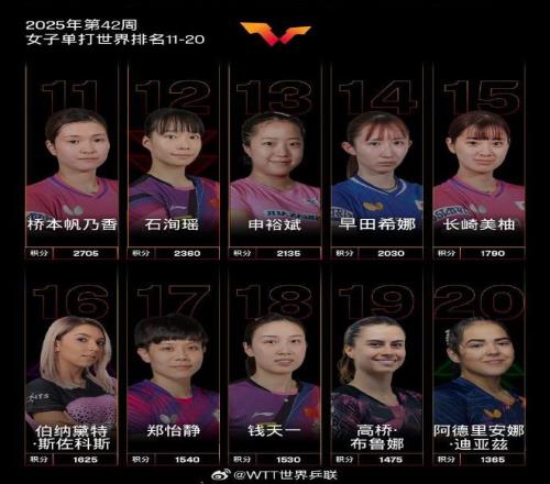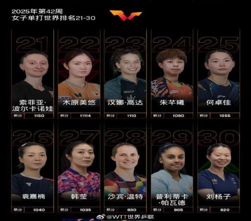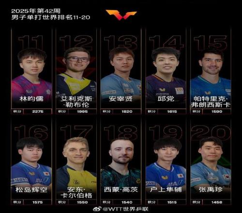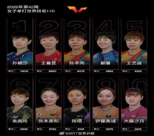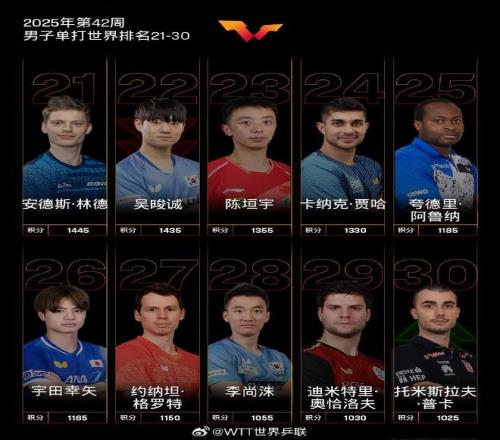 北京时间今日,国际乒联官方公布了2025年第42周世界排名。