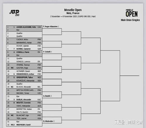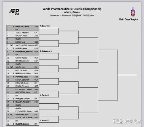 我们再来关注下周赛事。北京时间昨晚,下周的两站ATP250室内硬地赛公布了正赛签表。雅典站:德约科维奇、穆塞蒂、达尔德里、中岛-布兰登领衔出战;梅兹站:阿利亚西姆、梅德维德夫、布勃里克、科博利位列前四种子。需要说明的是,雅典站由原贝尔格莱德站迁址更名而来,原因是ATP运营标准限制及德约科维奇已定居雅典,而且赛事总监是德约科维奇的弟弟乔尔杰。