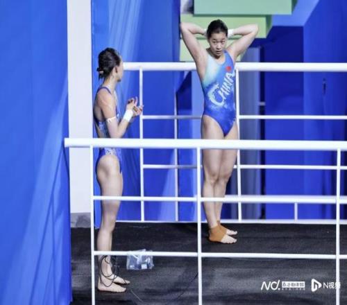 在赛前训练中,全红婵和陈芋汐、掌敏洁在跳台上聊天。