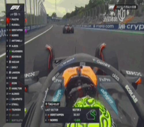 安东内利换上新黄胎后一路猛追到第7,而诺里斯在第31圈选择进站换上一套旧红胎,这意味着诺里斯也准备两停,红胎带来的圈速提升让诺里斯很快就在第33圈超过维斯塔潘来到第三的位置。