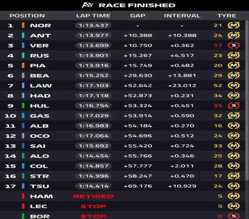 最后4圈,维斯塔潘进入安东内利的DRS区,不过红胎也到达极限,最终诺里斯第一完赛!安东内利守住位置第二完赛,维斯塔潘尽管只拿到第三,但要知道他是从维修区起步,实属不易,拉塞尔第四,皮亚斯特里第五。