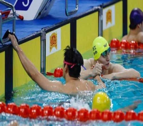 预赛中,潘展乐与孙杨同组,且赛道相邻。预赛结束后,二人在泳池握手。