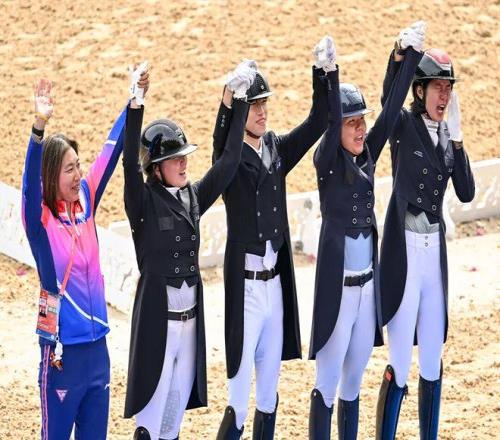 第十五届全国运动会马术盛装舞步团体决赛中,上海队的吴悦、徐墨菲、顾展兆、饶嘉怡携手以总分202.470(团体总分取最好的三人成绩相加)斩获金牌。新疆队收获银牌,广东队收获铜牌。