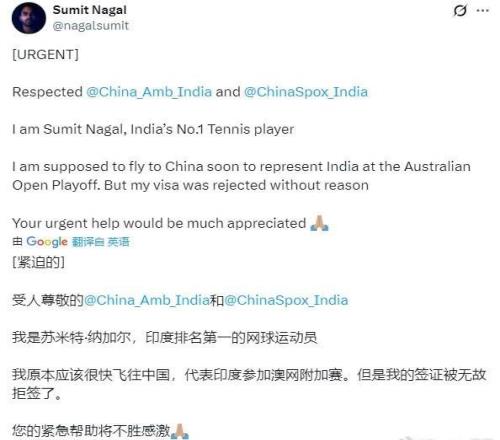 近日,据外媒报道,印度网球选手前往中国参赛遭拒签,社媒求助中国驻印度大使馆。