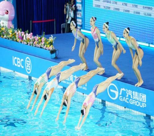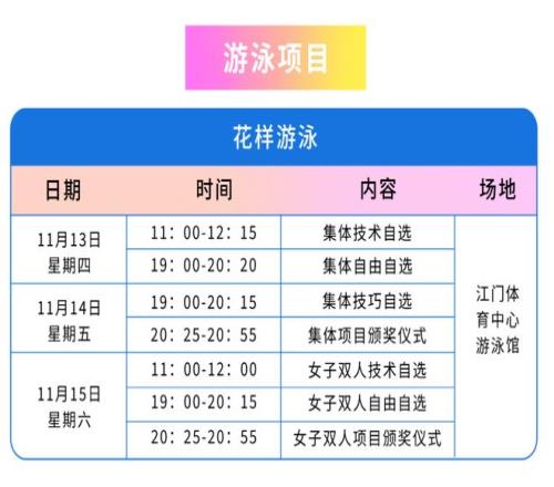 花样游泳作为体能、难度和艺术融合的项目,被称为“水中芭蕾”。本次花样游泳项目分为集体、女子双人两个小项。其中,集体项目要进行集体技术自选、集体自由自选、集体技巧自选三项较量,三项成绩之和总分最高的队伍将获得金牌,最后一项集体技巧自选将于11月14日19:00进行;女子双人项目则进行女子双人技术自选、女子双人自由自选两项较量,同样为两项成绩之和总分更高的队伍获胜,金牌花落谁家,将在11月15日女子双人自由自选比赛后揭晓。