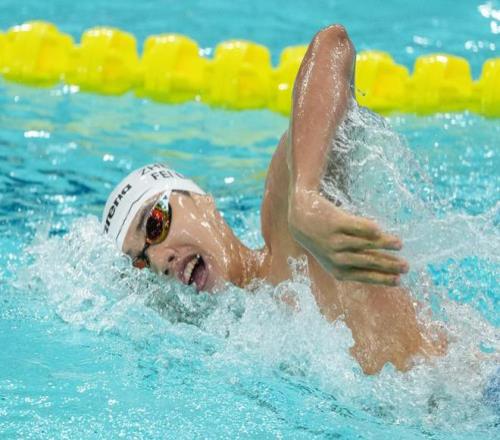 11月13日,男子800米自由泳决赛,18岁的山东小将张展硕再度登场。最终他以7分46秒69成绩获得第一名,创全国青年纪录。预赛第一名的费立纬获得第二。