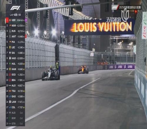 随后一圈维斯塔潘进站,虽然手握23秒以上的优势,但是进站换胎出现失误,出站后已经被拉塞尔追到了身后1.6秒左右。